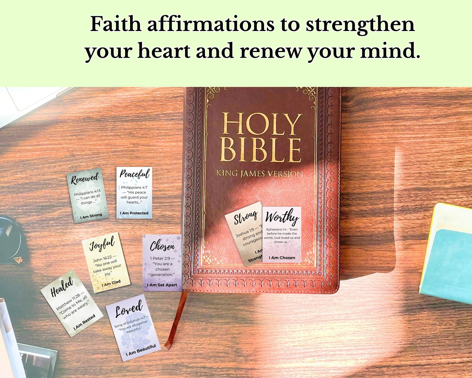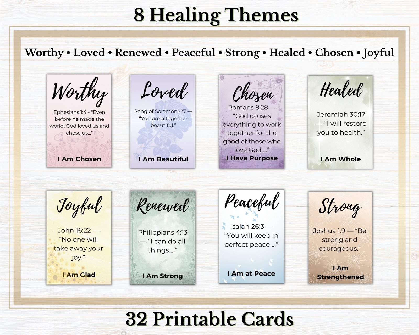 Each card pairs a Bible verse with a short “I Am” affirmation — gentle, faith-centered reminders of your worth, healing, and identity in Christ. Perfect for journaling, daily devotionals, or gifting to someone who needs encouragement.