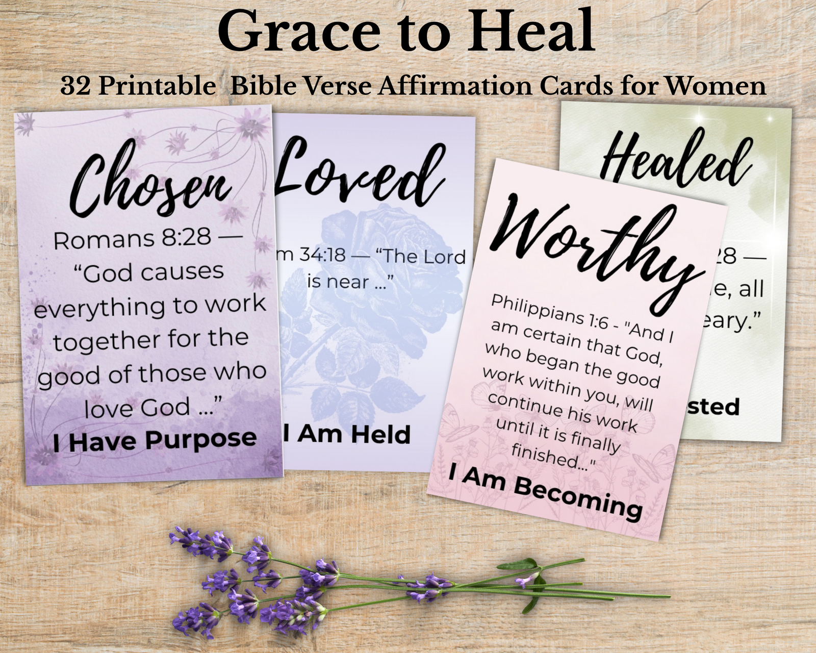 Find peace, strength, and renewal with these Grace to Heal Christian Affirmation Cards — a printable 32-card deck designed to help you reconnect with God’s truth and remember who you are in Him.